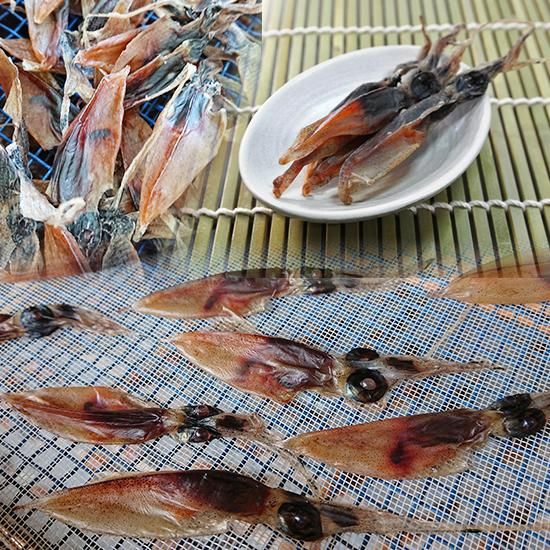 津居山港で水揚げされたホタルイカを新鮮なうちに1匹ずつ丁寧に干しました。目玉は取り除いてあります。さっと表面を炙るだけで、お手軽に美味しいおつまみになります。海水の塩味とほど良い苦みが絶妙です。居酒屋などでもお取り扱い頂いている人気商品です。冷凍にて保存し、必要な分だけ取り出してご利用ください。
