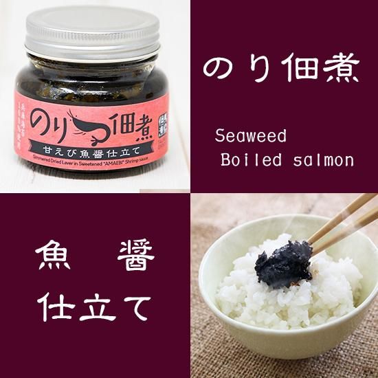 兵庫県産(瀬戸内海)の海苔使用。甘えびを使用した麹の魚醤で味付けした、美味しい海苔の佃煮です。