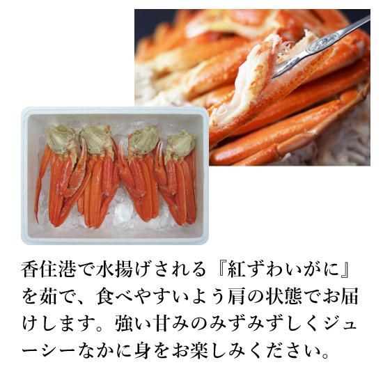 獲れたての新鮮な紅ずわいがにを出荷日当日に茹でて、食べやすいよう肩の状態でお届けします。