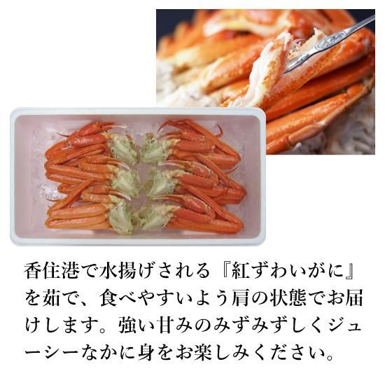 獲れたての新鮮な紅ずわいがにを出荷日当日に茹でて、食べやすいよう肩の状態でお届けします。