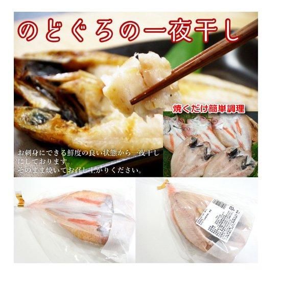 のどぐろは「赤むつ」の地方名で魚体は赤いですが喉が黒いことからこの名がつけられました。漁獲量が少なく超高級魚と言われており、白身の魚で非常に脂があるのが特徴です。お刺身にできる鮮度の良い状態で、一夜干し(干物)にしておりますので、そのまま焼いてお召し上がり下さい。