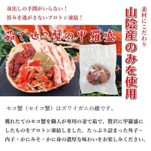 山陰の港で水揚げされたばかりのセコガニを、職人が専用の釜で茹で、贅沢に甲羅盛にしました。旨みを逃がさないプロトン凍結。身出しの手間がいらず、解凍後、そのままお召し上がりいただけます。たっぷり詰まった外子・内子・かにみそ・かに身の濃厚な味わいをお楽しみください。